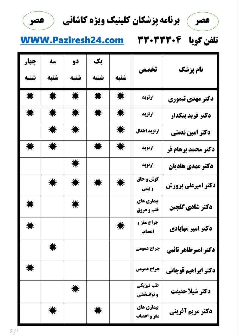 راهنمای مراجعین دفترچه تلفنلیست شماره تلفن های داخلی بیمارستانبرنامه صبح حضور پزشکان درمانگاهبرنامه حضور پزشکان کلینیک ویژه عصربرنامه کشیک اساتید درمانی-طب اورژانس-فک وصورت و گروههای آموزشیآدرس و تلفن مطب پزشکانتعرفه ها و قیمت های تقریبی (1403)نحوه گرفتن نوبت درمانگاهنحوه پذیرش بیمارفرآیند رسیدگی به شکایت ها